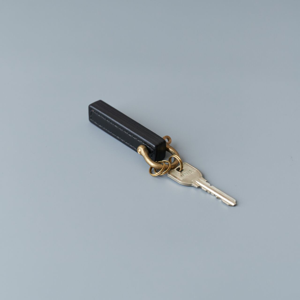 14mm厚に重ねた革を手縫いし、コバ(革の断面)を染色して仕上げたレザーキーホルダーです。